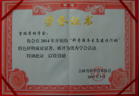 2015年3月12日,吉林省科協(xié)召開學會工作會議,對全省30個先進學會、39名優(yōu)秀學會干部、41項優(yōu)秀學會活動、35個優(yōu)秀專業(yè)委員會、5個宣傳工作優(yōu)秀學會進行表彰。吉林省林學會以全省學會評價總分81.4分、位列71個參評學會第二名的優(yōu)異成績,被授予2014年度全省先進學會,這是省林學會連續(xù)第11年被授予全省先進學會。同時,省林學會還被省科協(xié)授予2014年度全省宣傳工作優(yōu)秀學會,這是省科協(xié)首次評選宣傳工作先進;省林學會常務副秘書長孫鏡明被授予2014年度全省優(yōu)秀學會干部,科普服務生態(tài)建設行動被評為2014年度全省優(yōu)秀學會活動,省林學會森林經(jīng)理分會、林業(yè)職業(yè)技術(shù)培訓專業(yè)委員會被評為2014年度全省優(yōu)秀專業(yè)委員會。