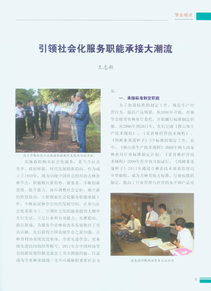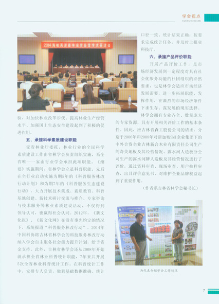 近年來,吉林省林學會緊緊圍繞全省林業(yè)中心工作和重點任務,立足本職,著眼服務,面向全省林業(yè),在政策允許的前提下,先后探索承接了林業(yè)科技獎勵、繼續(xù)教育、標準制定、林產(chǎn)品評價、科學素質(zhì)建設等一系列社會化服務職能,得到有關部門、機構以及社會有關方面的廣泛認可。