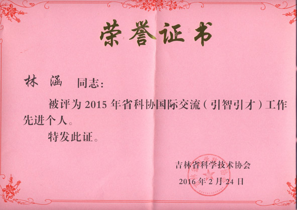 2016年2月24日,吉林省科學(xué)技術(shù)協(xié)會發(fā)布決定,表彰11個2015年省科協(xié)國際交流(引智引才)工作先進(jìn)集體和13名2015年省科協(xié)國際交流(引智引才)工作先進(jìn)個人。吉林省林學(xué)會及學(xué)會干部林涵分別入選先進(jìn)集體、先進(jìn)個人。