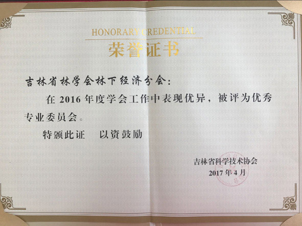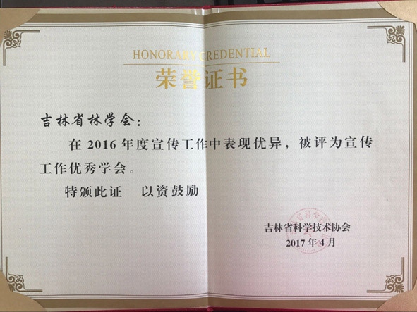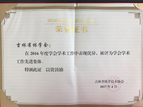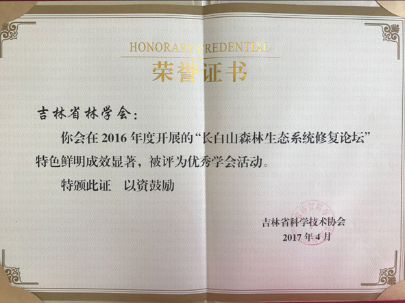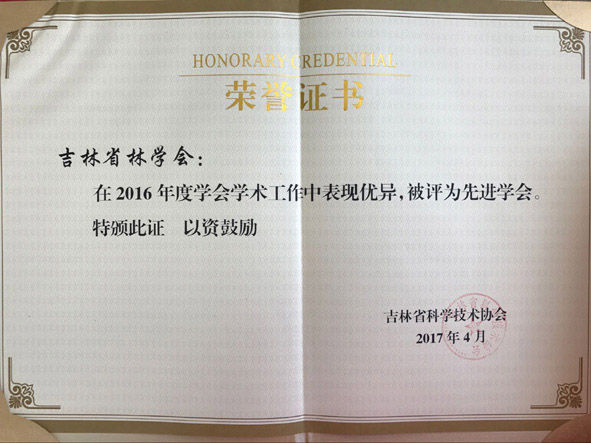 2017年4月26日、27日,吉林省科學(xué)技術(shù)協(xié)會(huì)分別發(fā)布決定,對(duì)2016年度全省先進(jìn)學(xué)會(huì)、優(yōu)秀學(xué)會(huì)干部、優(yōu)秀學(xué)會(huì)活動(dòng)、優(yōu)秀專業(yè)委員會(huì)、宣傳工作優(yōu)秀學(xué)會(huì)和學(xué)會(huì)學(xué)術(shù)工作先進(jìn)集體、先進(jìn)個(gè)人進(jìn)行表彰。吉林省林學(xué)會(huì)被授予“2016年度先進(jìn)學(xué)會(huì)”、 “2016年度宣傳工作優(yōu)秀學(xué)會(huì)”、“2016年度學(xué)會(huì)學(xué)術(shù)工作先進(jìn)集體”,王志新理事長(zhǎng)被授予“2016年度優(yōu)秀學(xué)會(huì)干部”,劉愛萍副秘書長(zhǎng)被授予“2016年度學(xué)會(huì)學(xué)術(shù)工作先進(jìn)個(gè)人”,吉林省林學(xué)會(huì)舉辦的“長(zhǎng)白山森林生態(tài)系統(tǒng)修復(fù)論壇”被評(píng)為“2016年度優(yōu)秀學(xué)會(huì)活動(dòng)”,吉林省林學(xué)會(huì)林下經(jīng)濟(jì)分會(huì)被評(píng)為“2016年度優(yōu)秀專業(yè)委員會(huì)”。這是吉林省林學(xué)會(huì)連續(xù)第二年包攬省科協(xié)表彰的全部獎(jiǎng)項(xiàng),也是連續(xù)第十四年榮獲全省先進(jìn)學(xué)會(huì)稱號(hào)。