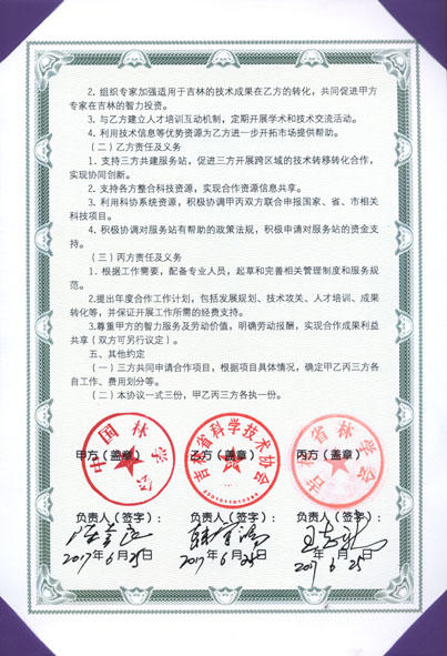 為進(jìn)一步落實(shí)中國科協(xié)《實(shí)施創(chuàng)新驅(qū)動(dòng)助力工程意見》,充分發(fā)揮學(xué)會的科技支撐作用,更好地服務(wù)我省經(jīng)濟(jì)社會發(fā)展,經(jīng)省科協(xié)商請中國林學(xué)會同意,決定在省林學(xué)會成立中國林學(xué)會吉林省服務(wù)站。2017年6月25日,在吉林長春舉行合作協(xié)議簽字儀式,中國林學(xué)會副理事長兼秘書長陳幸良、吉林省科協(xié)副主席韓宇鴻、吉林省林學(xué)會理事長王志新分別代表甲乙丙各方在協(xié)議書上簽字,并一同參加“創(chuàng)新驅(qū)動(dòng)助力吉林老工業(yè)基地振興行動(dòng)”集體簽約儀式。