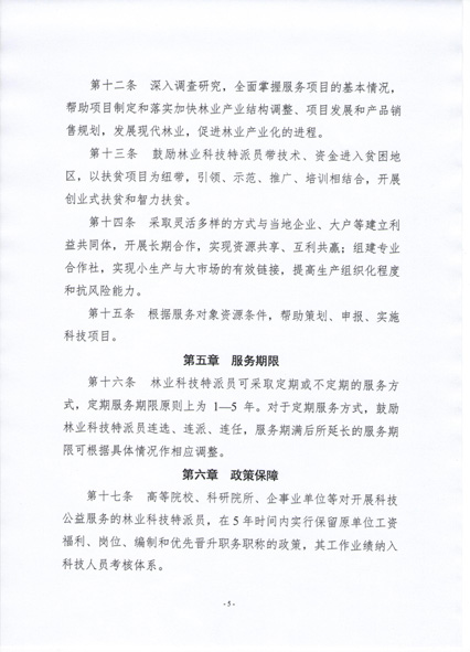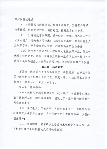 第五條 選派范圍主要從高等院校、科研院所、企事業(yè)單位的中級職稱以上科技人員中選派。鼓勵林場、林業(yè)站等基層單位技術(shù)員、實(shí)用人才、專業(yè)大戶參與。