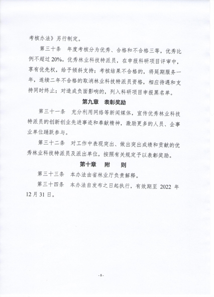 第三十條 年度考核分為優(yōu)秀、合格和不合格三等,優(yōu)秀比例不超過20%。優(yōu)秀林業(yè)科技特派員,在申報科研項(xiàng)目評審中,享有優(yōu)先權(quán),給予傾斜支持;考核結(jié)果不合格的,將延期服務(wù)一年,連續(xù)二年不合格的取消林業(yè)科技特派員資格,相應(yīng)待遇和支持同時終止;對造成負(fù)面影響的,列入科研項(xiàng)目申報黑名單。