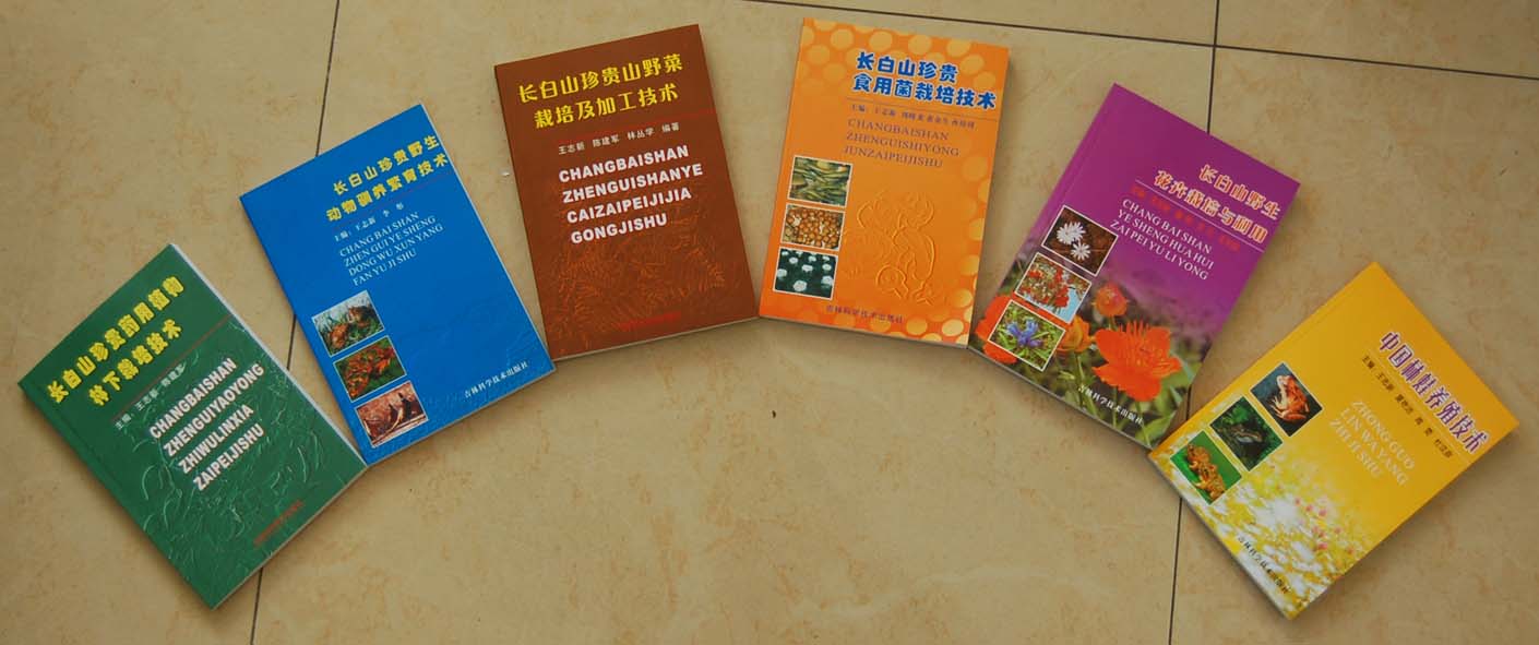 《長白山珍貴藥用植物林下栽培技術(shù)》(2005年1月出版)、《長白山珍貴野生動物馴養(yǎng)繁育技術(shù)》(2005年12月出版)、《長白山珍貴山野菜栽培及加工技術(shù)》(2006年12月出版)、《長白山珍貴食用菌栽培技術(shù)》(2007年11月出版)、《長白山野生花卉栽培與利用》(2008年12月出版)、《中國林蛙養(yǎng)殖技術(shù)》(2008年12月出版)
